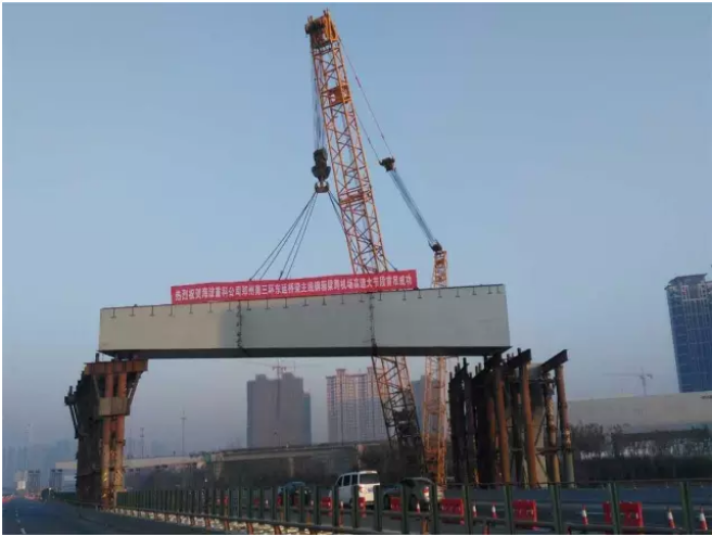 ? ? ? 鄭州南三環東延工程(南臺路-經開第五大街)第二標段Z22聯鋼箱梁,總長度165m,中跨跨度75m,全聯鋼箱梁總重量3100余噸,鋼箱梁梁高為變高度,最大梁高3.8m,該聯鋼箱梁上跨機場高速公路,高速公路上車流不斷,同時下穿金機線和金李線兩條高壓線,高壓線距離鋼箱梁橋面僅為17m,該項目經過多方專家論證,最終采用大節段拼裝后吊裝的施工工藝,克服了高速公路上不能設置臨時支架的難點。單個最大鋼箱梁吊裝節段重量達162噸,為克服上跨高速公路和下穿高壓線的難點,現場采用額定起重量為450噸的大型履帶吊進行吊裝。